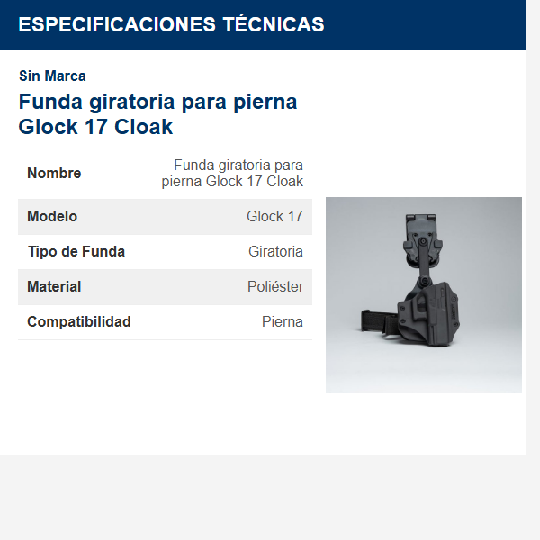 En conclusión, si buscas una funda que combine comodidad, seguridad y accesibilidad, la Funda Giratoria para Pierna Glock 17 Cloak es la elección ideal. No comprometas tu seguridad ni tu comodidad; adquiere la tuya hoy y experimenta la diferencia. ¡Tu Glock 17 merece lo mejor!