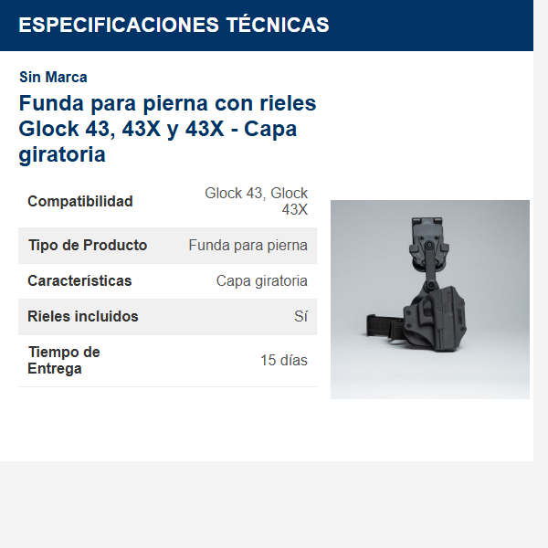 ¿Te preocupa la seguridad y el acceso rápido a tu Glock 43, 43X o 43X? La solución está aquí. La funda para pierna con rieles es la respuesta a tus necesidades de portación. Diseñada para ofrecerte la máxima comodidad y funcionalidad, esta funda es ideal para quienes buscan un equipo de calidad que no comprometa su seguridad.