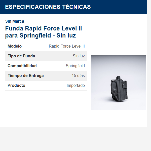 Funda Rapid Force Level Ii para Springfield – Sin luz. Este Producto Tarda En Llegar 15 Dias Despues De Su Pago. Preguntar Por Disponibilidad Antes De Realizar El Pago. Producto Importado Previo Pago.
