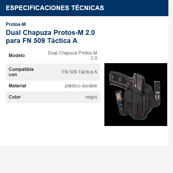 • Compatibilidad perfecta: Diseñada específicamente para el FN 509 Táctica A, asegurando un ajuste preciso y seguro.
