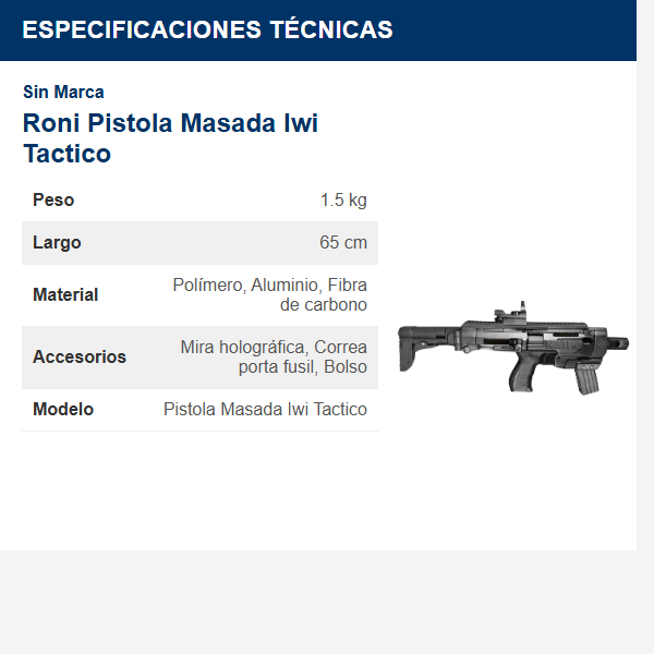 En el contexto de la seguridad privada en Colombia, un «roni pistola masada iwi tactico» podría ofrecer una ventaja táctica en situaciones de alto riesgo. Imagine un escenario donde un guardia de seguridad debe responder a un intento de robo a mano armada en una instalación. El uso de un chasis Roni con su IWI Masada le permitiría: