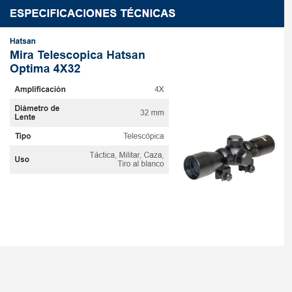 La mira telescópica Hatsan Optima 4×32 es un accesorio diseñado para rifles de aire comprimido y armas de fuego de baja potencia. Su designación ‘4×32’ indica un aumento fijo de 4x y una lente objetivo de 32 mm de diámetro. Este tamaño de lente objetivo permite una buena captación de luz en condiciones de iluminación moderada, mejorando la visibilidad del objetivo.