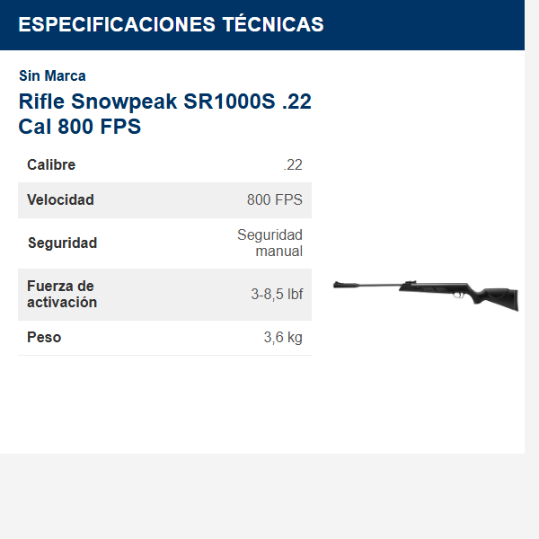 Sé el primero en valorar “Rifle Snowpeak SR1000S .22 Cal 800 FPS”